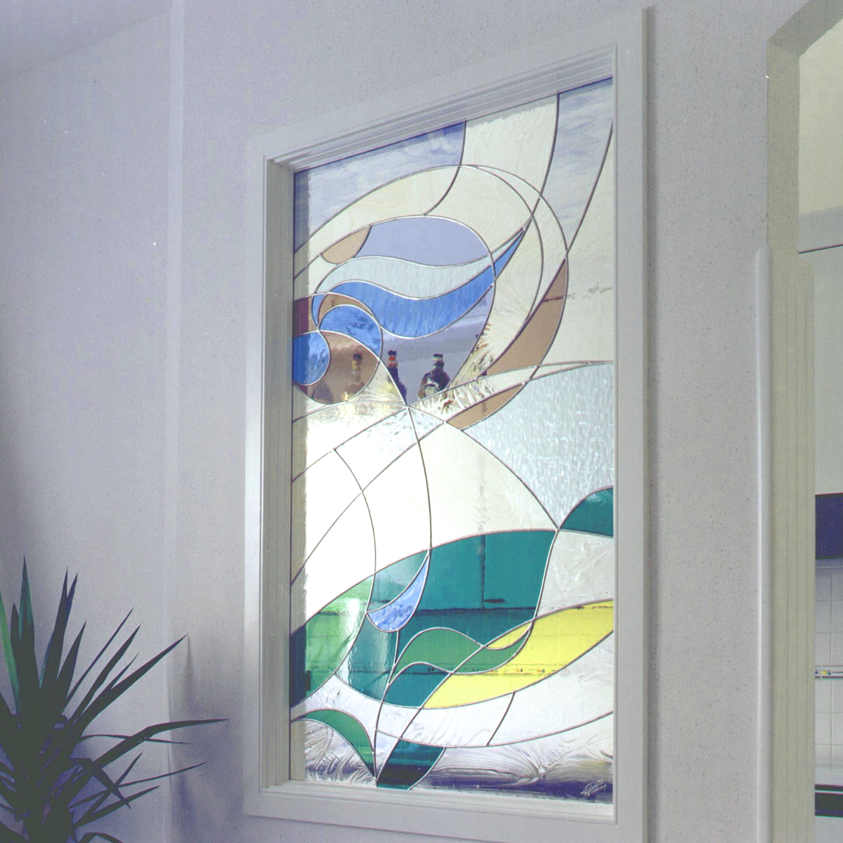 Vetrata in stile astratto affiancata al passaggio cucina soggiorno.