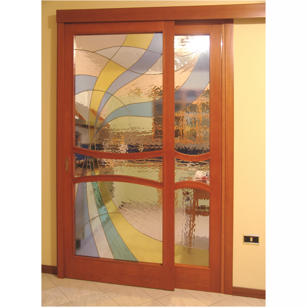Porta scorrevole su parete, divide salone e cucina, composta da due elementi in stile astratto moderno