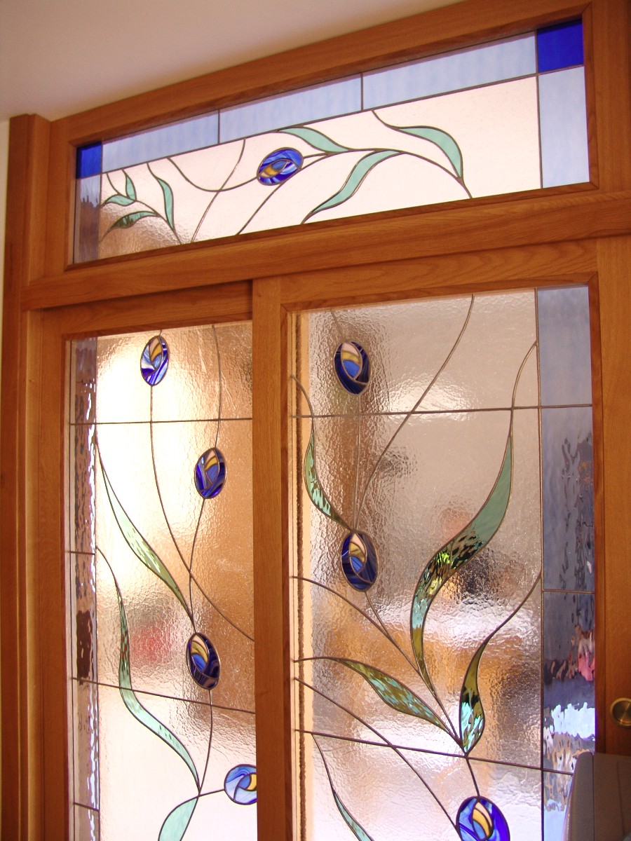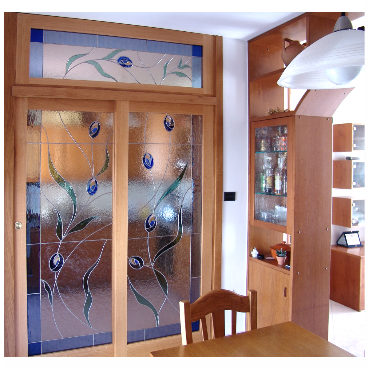 Vetrata scorrevole e sopraluce con fiori stilizzati. La vetrata è in posizione tra l'angolo cottura e il soggiorno.