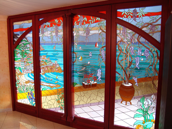 Vetrata in grandi porte, due fisse più due centrali con movimento a ventola. Paesaggio costiero " Amalfi ".