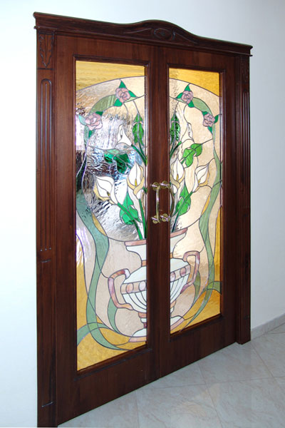Porta vetrata doppia, in legno noce, scorrevole avanti al muro, " vaso con calle e rose."