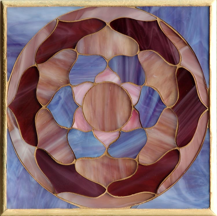 Mosaici composti da vetri nobili opalescenti con tecnica mosaico su base in legno naturale e cornice semitonda.