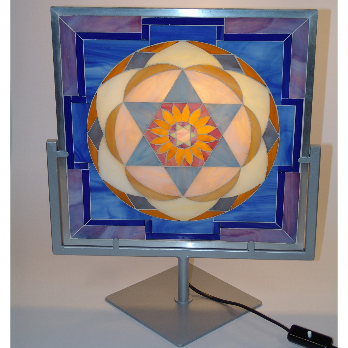 Composizione di mosaico su base di vetro diffusore e cornice in alluminio di cm. 35,5 x cm. 35,5